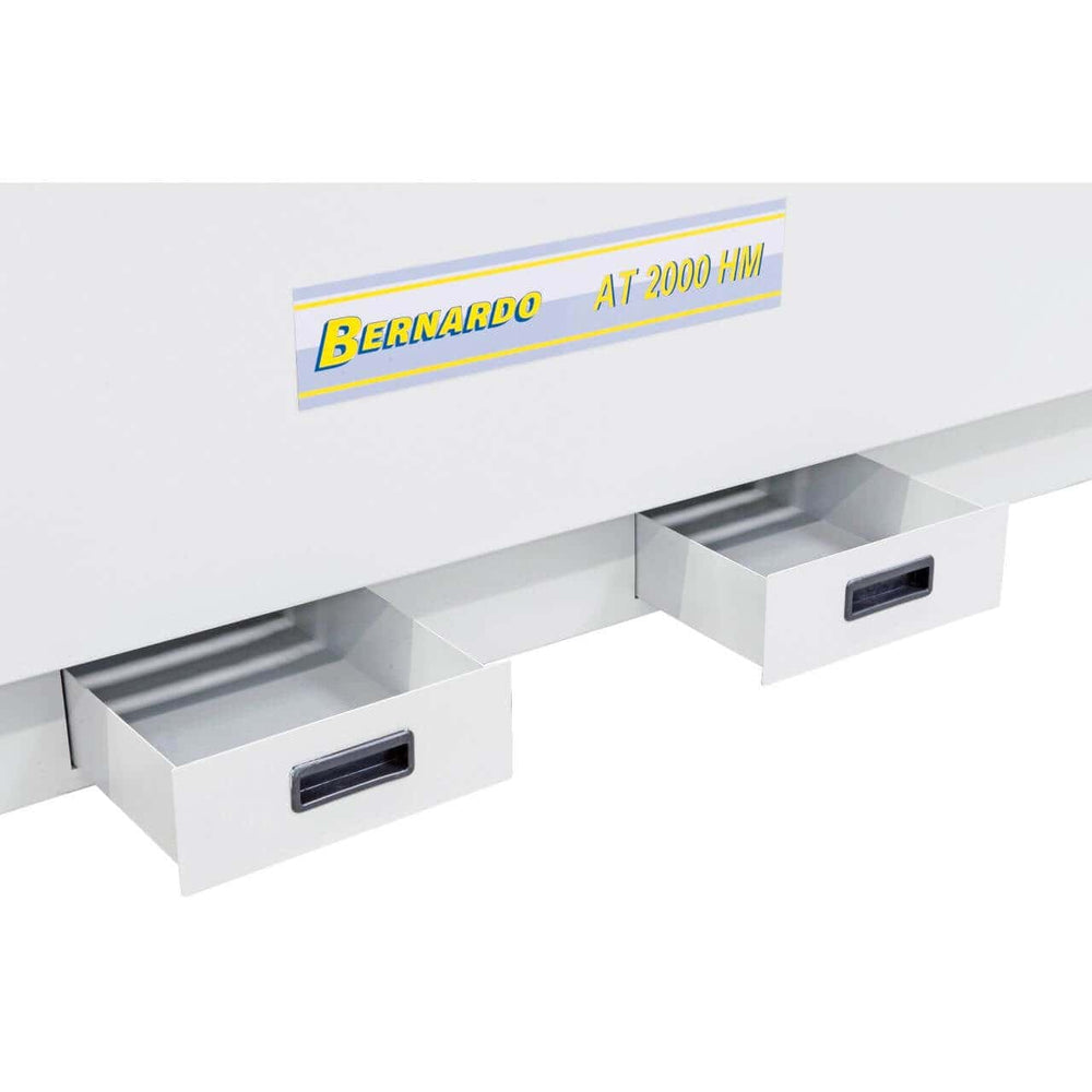 Il Bernardo AT 2000 HM è un banco di aspirazione ad alte prestazioni, ideale per lavorazioni di legno e metallo che producono grandi quantità di polvere e trucioli. Equipaggiato con due motori da 1,0 kW (2x 1,5 CV) e una potenza di aspirazione fino a 2x 3000 m³/h, garantisce un ambiente di lavoro sempre pulito ed efficiente. Il piano di lavoro misura 2110 x 550 mm, con altezza ergonomica di 825 mm e resistenza fino a 250 kg. Il banco è fornito con 4 filtri per legno e metallo, interruttore ON-OFF integrato, appoggi del piano in gomma antigraffio e 6 arresti pezzo per fissaggi sicuri. Con una struttura robusta e un peso complessivo di 132 kg, l’AT 2000 HM è la soluzione ideale per officine e falegnamerie che richiedono massima potenza e affidabilità.