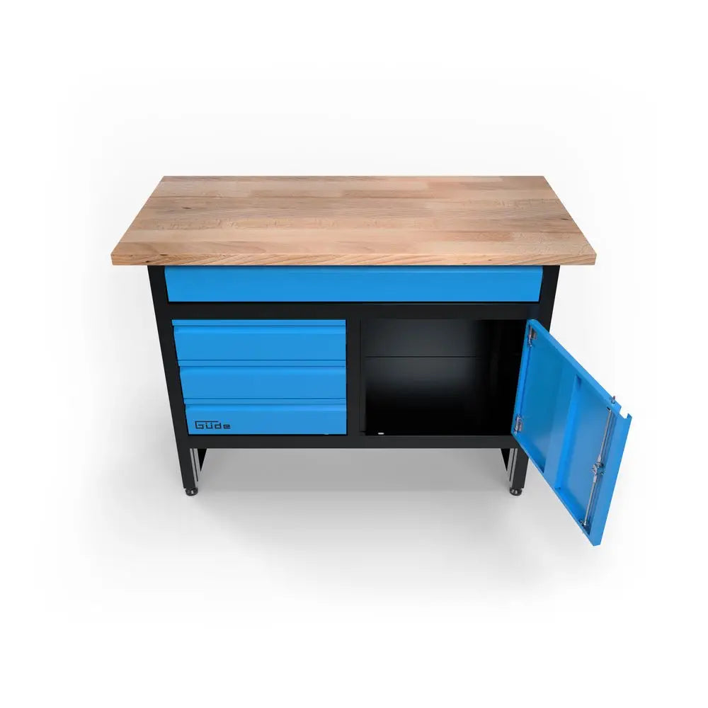 Il banco da lavoro Güde GW 3/1 appartiene alla linea professionale Güde Eco Line, progettata per offrire massima robustezza, modularità e praticità in officina e garage. Il solido piano di lavoro in legno di gomma massello incollato a listelli garantisce un’elevata resistenza all’usura, risultando circa il 50% più duro del rovere, oltre a essere insensibile all’umidità e facile da pulire. Con una portata massima di 300 kg, il banco è adatto a lavorazioni impegnative. La configurazione con tre cassetti piccoli e un cassetto grande, tutti a estrazione totale su guide a sfere, consente un’organizzazione efficiente degli utensili. L’anta inferiore chiudibile a chiave assicura uno spazio di stoccaggio protetto, mentre i piedini regolabili permettono di adattare l’altezza di lavoro da 850 a 885 mm.