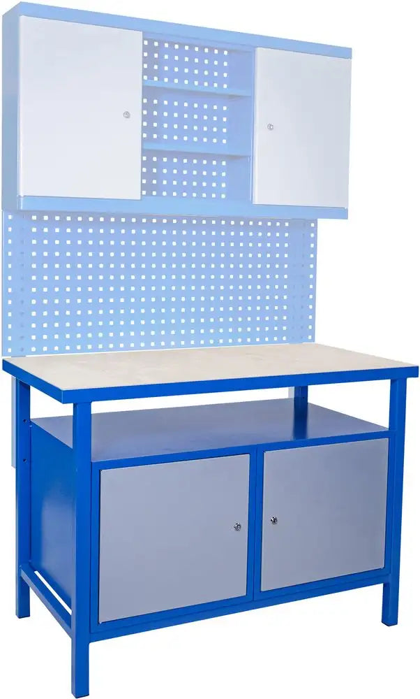 Il piano da 38 mm, impiallacciato in faggio su entrambi i lati e supportato da un pannello ad alta densità, offre una superficie resistente all’usura quotidiana. Questo modello integra due vani chiusi con ante rinforzate, ciascuno dotato di due ripiani removibili, per un totale di quattro ripiani interni. Le serrature a cilindro con 2 chiavi garantiscono la sicurezza degli utensili. La verniciatura a polvere blu RAL 5015 per la struttura e grigio RAL 7001 per le ante dona un aspetto professionale e ordinato. Un banco affidabile firmato Güde.