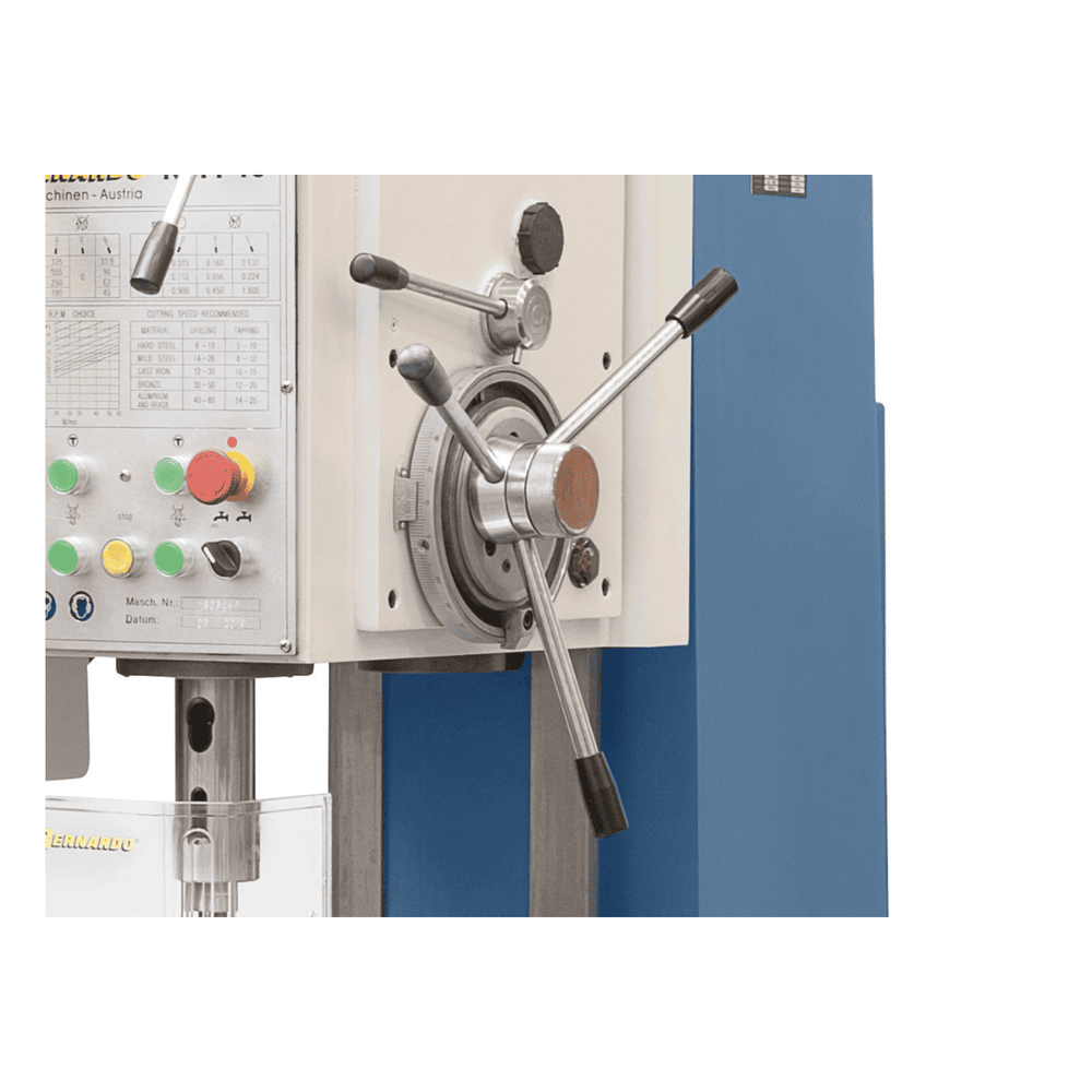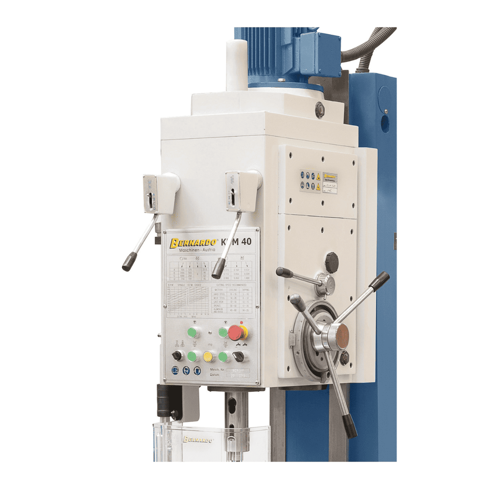 Il Bernardo Trapano a colonna fissa KBM 40 è progettato per applicazioni professionali e industriali che richiedono potenza, precisione e robustezza. Con una capacità di foratura fino a 40 mm e filettatura fino a M30, si distingue per le prestazioni elevate e la solidità della costruzione in ghisa grigia. Il motore da 3,0 kW eroga una coppia di 350 Nm con forza di avanzamento fino a 16.000 N, garantendo lavorazioni affidabili e costanti. Il mandrino dispone di avanzamento automatico con 9 gamme di avanzamento e 12 velocità comprese tra 31,5 e 1400 giri/min. La tavola in ghisa con cave a T e sollevamento di 315 mm assicura massima versatilità. Dotato di dispositivo di filettatura con inversione automatica, lampada LED, refrigerante e protezioni di sicurezza, il KBM 40 è un trapano a colonna ideale per officine e produzioni meccaniche pesanti.