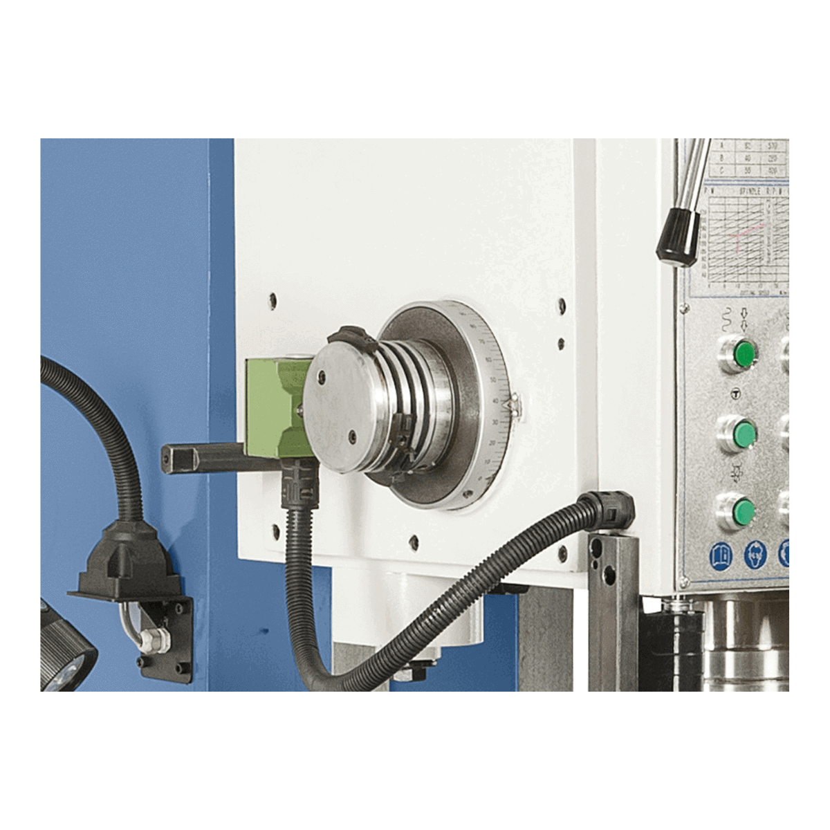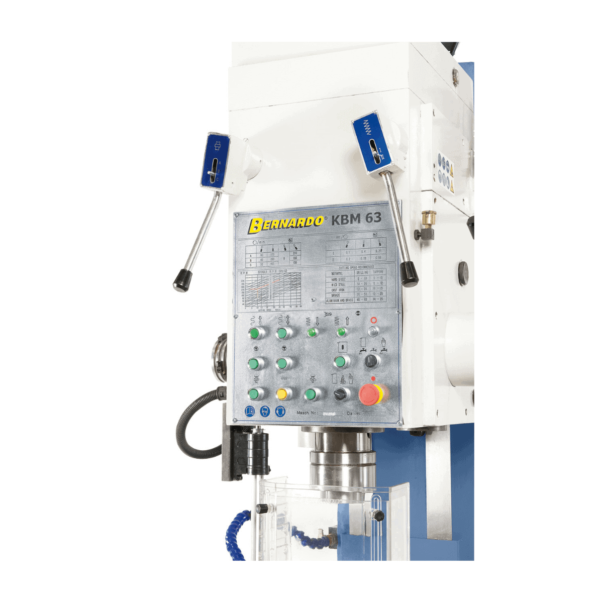 Il Bernardo Trapano a colonna fissa KBM 63 è una macchina industriale progettata per la meccanica pesante e le applicazioni professionali che richiedono precisione, stabilità e potenza elevata. Con capacità di foratura fino a 63 mm in acciaio e filettatura fino a M48, si distingue per la sua robustezza e affidabilità. Il motore da 5,5 kW garantisce una coppia di 800 Nm e una forza di avanzamento fino a 30.000 N. Grazie all’avanzamento automatico del mandrino, al dispositivo di filettatura con inversione automatica e alla guida a coda di rondine regolabile, le lavorazioni risultano fluide e precise. La tavola in ghisa con cave a T da 22 mm e il sollevamento di 300 mm assicurano massima versatilità. Dotato di dispositivo refrigerante, lampada LED e protezioni integrate, il KBM 63 è una scelta affidabile per produzioni industriali di alto livello.