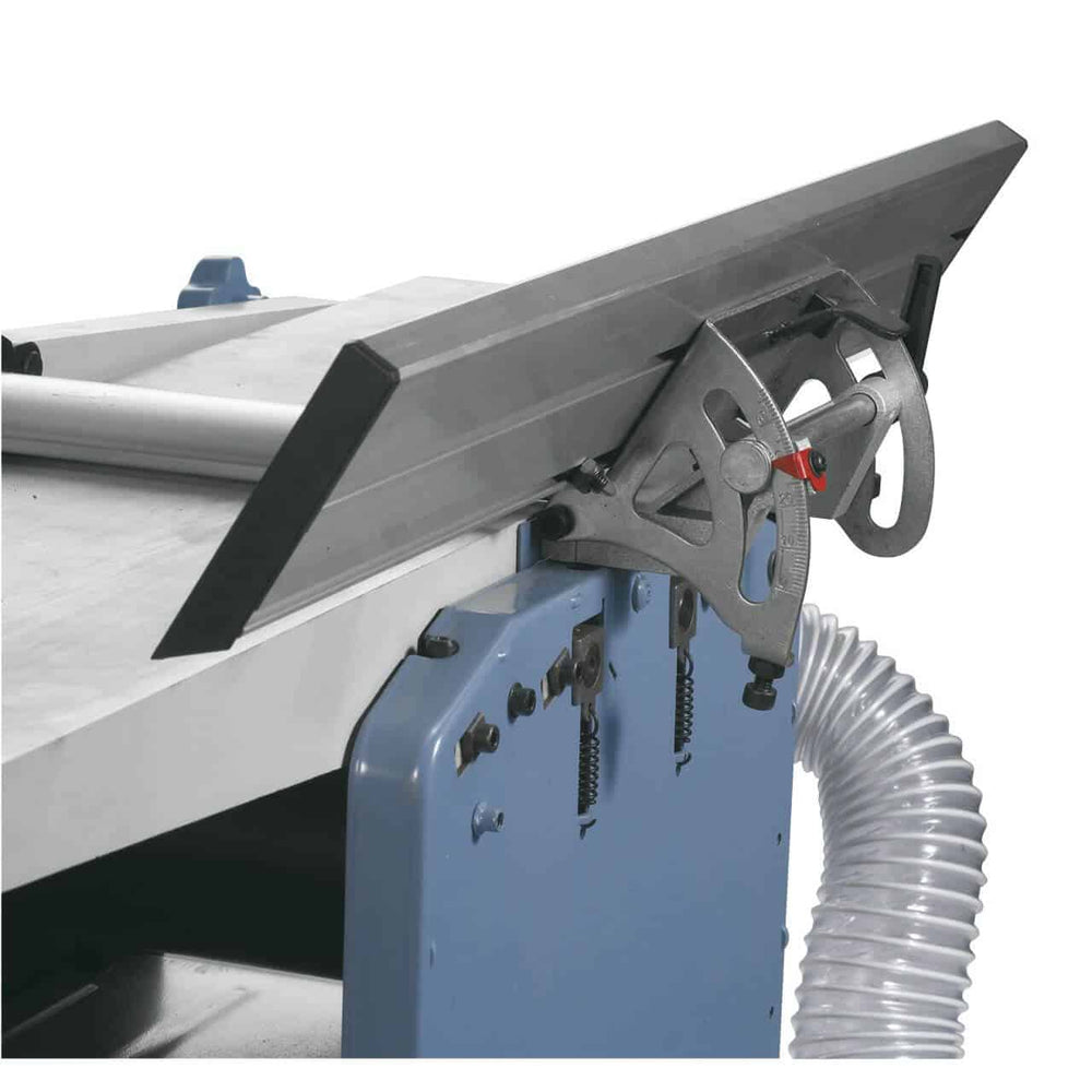 L’albero pialla a 2 lame HSS con velocità di 8500 giri/min garantisce superfici lisce e precise. La battuta inclinabile da 90° a 45° permette lavorazioni versatili, mentre la funzione di spessore consente passaggi da 5 a 210 mm con asportazione massima di 2 mm.