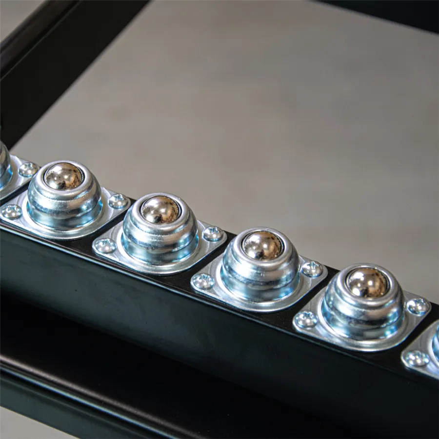 Il Supporto a Sfere Robusto è dotato di tre file di cuscinetti a sfera da 16 mm (8 per tre file), offrendo una superficie di appoggio di 350 × 560 mm. Questo stand è regolabile in altezza da 725 mm a 1140 mm e può essere bloccato in qualsiasi posizione mediante un sistema di bloccaggio a cuneo, garantendo impostazioni ferme e prive di scivolamenti. Costruito solidamente in profili d'acciaio, è capace di sostenere carichi fino a 200 kg. I piedi sono regolabili in altezza per eliminare qualsiasi squilibrio del pavimento e garantire stabilità in tutte le situazioni. Il supporto è completamente ripiegabile, consentendo un comodo stoccaggio o trasporto. Fornisce supporto a materiali di grandi dimensioni, rendendolo ideale per l'uso professionale e commerciale.