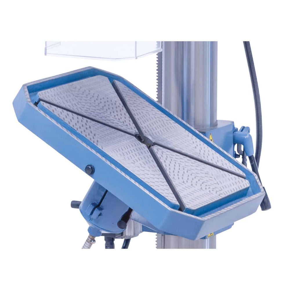 La macchina dispone di 4 avanzamenti automatici del mandrino tramite frizione elettromagnetica, dispositivo di filettatura integrato e sgancio automatico dell’utensile. Il piano di lavoro in ghisa massiccia (540 x 435 mm) è orientabile di 45° e girevole attorno alla colonna, mentre la base con pompa di refrigerazione integrata garantisce lavorazioni sicure e continue. Con una concentricità del mandrino ≤0,02 mm, ingranaggi temprati e rettificati in bagno d’olio e motore da 2,0 kW, il GB 45 NC Vario assicura prestazioni elevate anche in impieghi intensivi.
