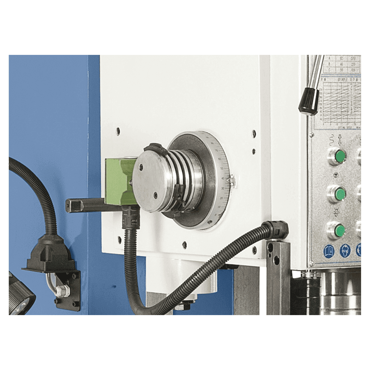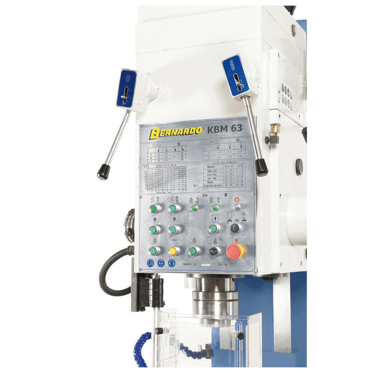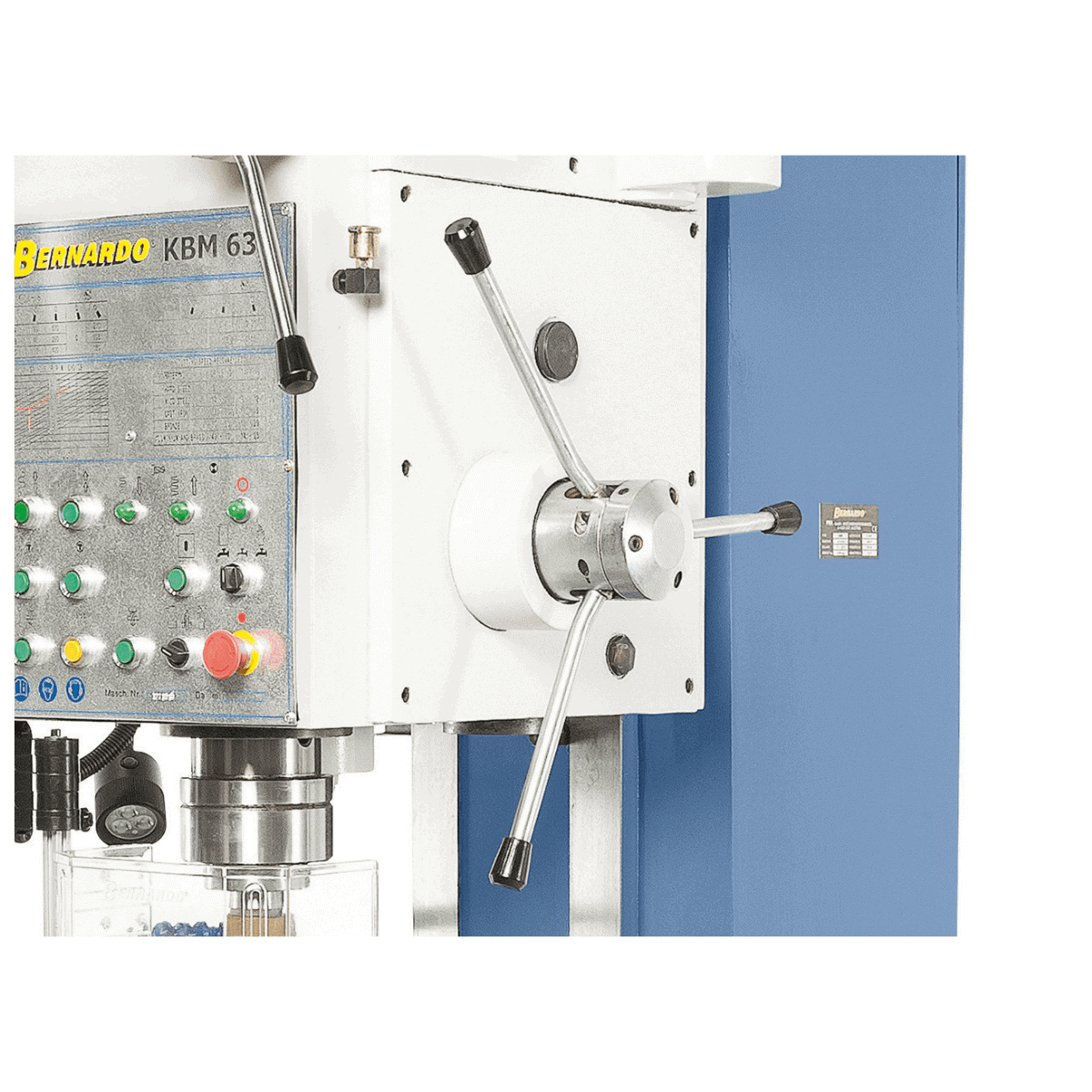 Il Bernardo Trapano a colonna fissa KBM 80 è progettato per lavorazioni industriali pesanti che richiedono massima precisione, forza e stabilità. La sua struttura in ghisa grigia massiccia, unita a una colonna robusta, garantisce elevata capacità di carico della tavola e lunga durata. Con capacità di foratura fino a 80 mm e filettatura fino a M56, è ideale per la meccanica pesante e per produzioni ad alto volume. Il motore da 5,5 kW sviluppa una coppia di 800 Nm e una forza di avanzamento fino a 30.000 N. L’avanzamento automatico del mandrino, il dispositivo di filettatura con inversione automatica e la guida a coda di rondine regolabile offrono affidabilità e fluidità d’uso. La dotazione standard comprende dispositivo di raffreddamento, lampada LED, protezione regolabile e utensili, rendendo il KBM 80 una macchina di riferimento nel settore industriale.
